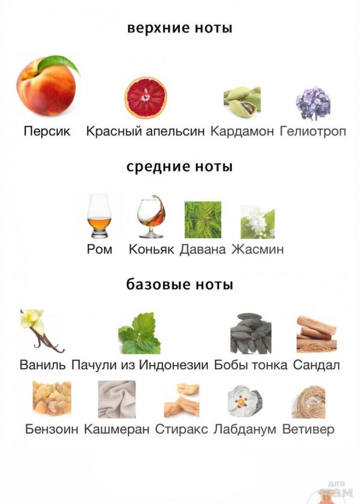 Аромат персика смешивается с сицилийским красным апельсином, маслом даваны, ромом и коньяком, индонезийскими пачули, сандалом, лабданумом и ванилью. Композиция описывается как сладкая и чувственная, но также богатая и характерная, с ярко выраженными древесными и смолистыми оттенками.