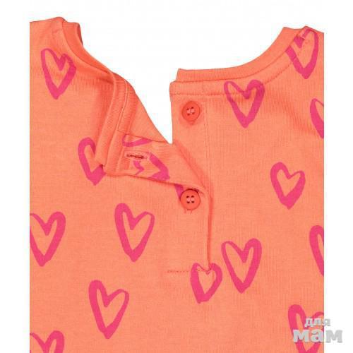Футболка: Короткий рукав-крылышко, Однотонная бейка, Пуговицы на спине, Рисунок "Сердечки", Цвет: оранжевый + малиновый и Рисунок "цветочная полянка", Кнопки на спине цвет розовый.