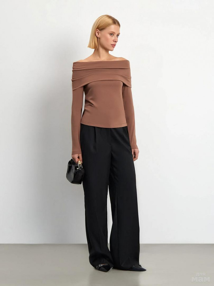 Элегантный трикотажный логслив в цвете мокко. Модель красиво открывает плечи и прикрывает зону декольте ниже ключиц модной драпировкой-хомутом. Имеет приталенный крой, мягко облегает фигуру. Сделает интереснее образы с базовым низом, подойдёт к трендовым брюкам или юбкам из экокожи. Будет уместен в коктейльных и выходных образах