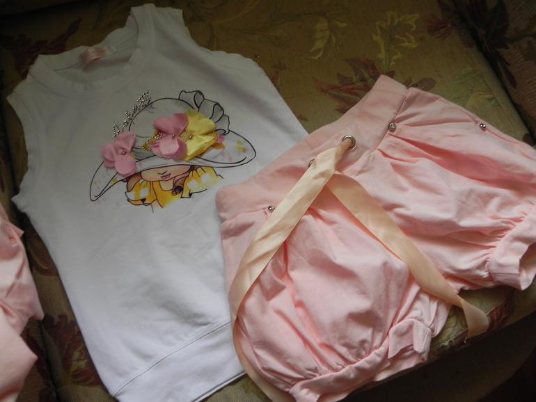 Добрый вечер! В наличии 1. Сарафан Армани в начале поста, 2. платье кола (очень здорово выглядит) на 130 размер (идёт на 122/128) -500 руб, 3. костюмчик на 122 размер (от пояса вверху покрасились штанцы) цена 250 руб,?