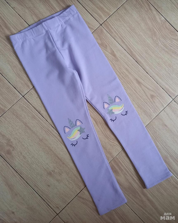 НОВЫЕ утепленные леггинсы H&M (Швеция) р.134. Леггинсы из плотного хлопкового трикотажа сиреневого цвета с регулируемой резинкой на талии и мягким вором внутри. Блестящие аппликации Единороги на коленях.