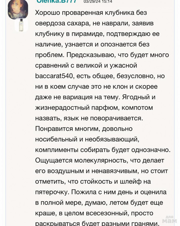 С одной стороны, это блюдо молекулярной кухни, скорее всего — десерт, в котором привычный ольфакторный профиль деконструировали и собрали обратно с использованием изо-е-супера, лактонов и мускусов. В итоге мы имеем, скорее, клубничное безе — цветочно-метилантранилатно-сладкое, но воздушное.