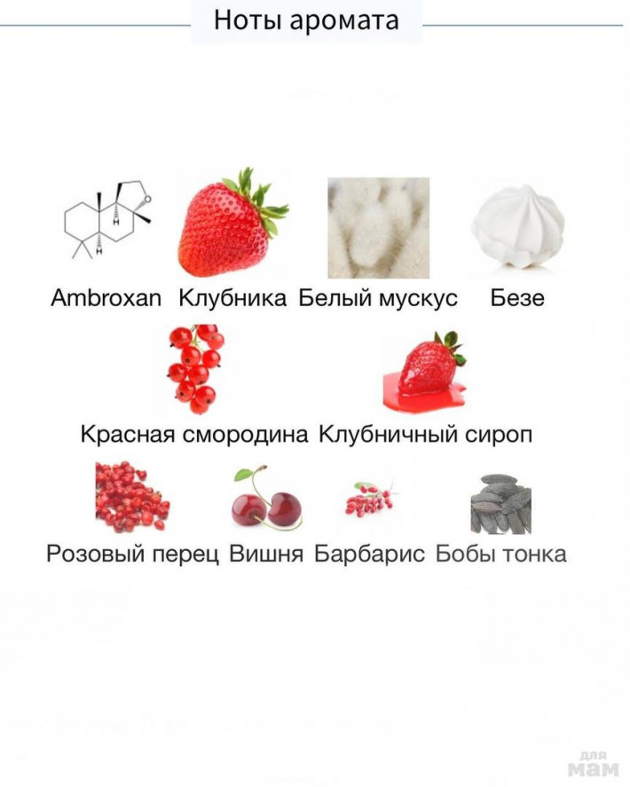 Ноты: красная смородина, розовый перец, клубника, вишня, барбарис, аккорд сахарного сиропа, безе, амбоксан, белый мускус, бобы тонка.