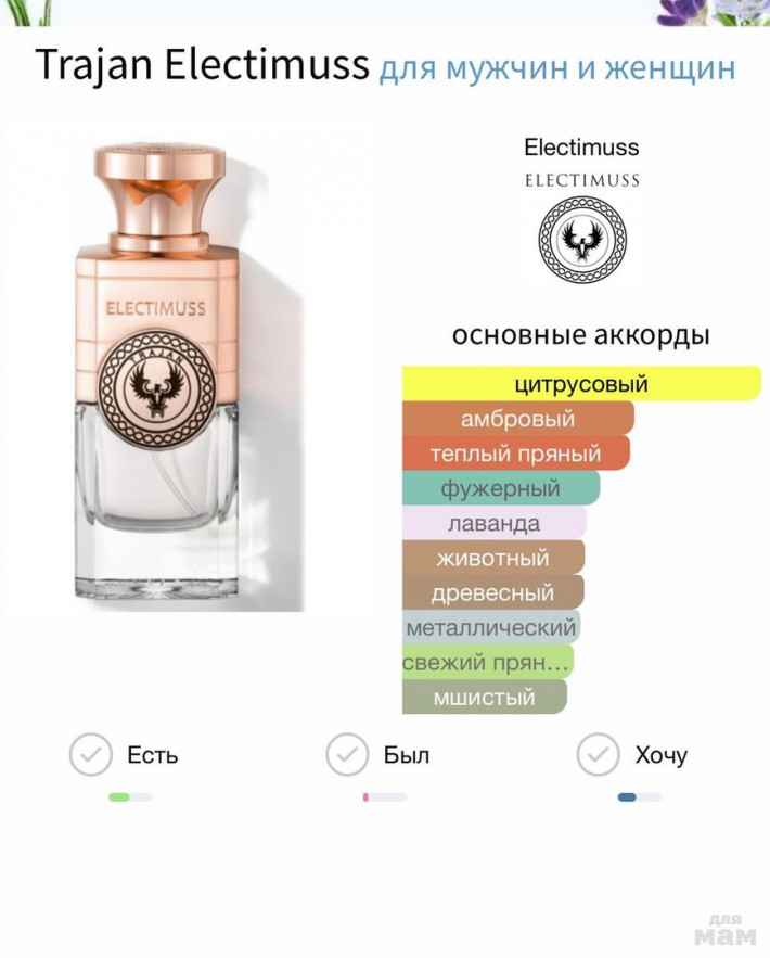 В начале пути вдохните сладкую свежесть цитрусовых рощ, наполненных солнечными нотами мандарина, лимона, бергамота и красного апельсина. Затем парфюм Electimuss Trajan приглашает на прогулку по полям лаванды и шалфея. Мягкая пряность шафрана придает сердечному аккорду предвкушение ароматов восточных сладостей и пряностей. Запах лимонных рощи и сладкой герани, пронизанные звездчатым анисом и гвоздикой, в финальном аккорде смешиваются с чуть более темной основой из пачули, амбры, хвойно-дымного кедра, дубового мха и мягкой кожи, формируя долгое и загадочное ароматическое послевкусие.