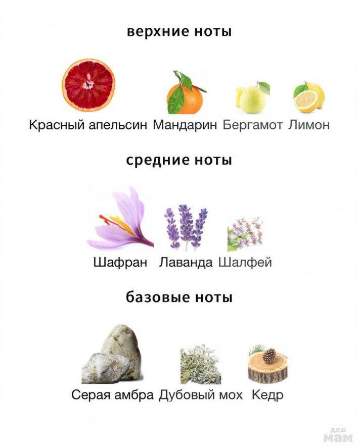 Композиция аромата включает в свой состав следующие базовые ноты : Красный апельсин, Кедр, Мандарин, Шафран, Лаванда, Лимон, Шалфей, Бергамот, Амбра, Дубовый мох