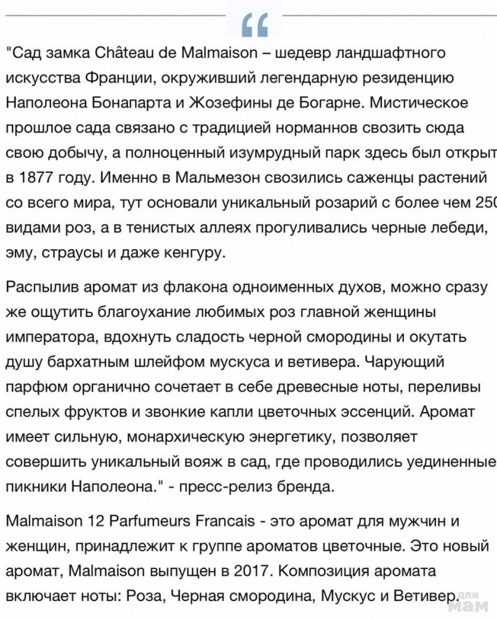 Malmaison от 12 Parfumeurs Francais продолжает тему парфюмерной зелени, только на этот раз речь идет не о пряных травах, а о самой обычной свежескошенной траве, запах которой как-то по-особенному бодрит и освежает. Cад замка Château de Malmaison, в честь которого назван аромат, – шедевр ландшафтного искусства Франции. Он окружает легендарную резиденцию Наполеона Бонапарта и славится своими розами. Вопреки официальной пирамиде, роз здесь я не нашел, зато обнаружил аккуратно подстриженные газоны, а еще — кусты черной смородины.