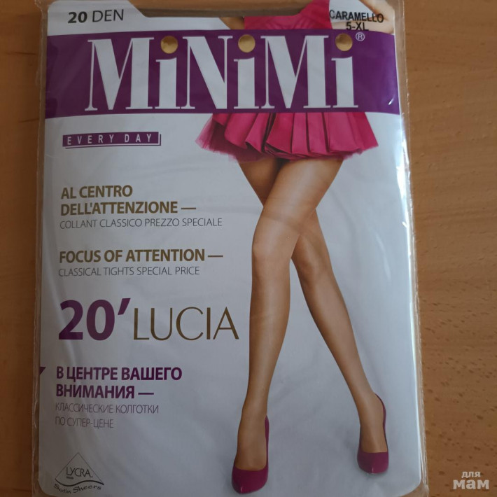 Колготки женские MiNiMi LUCIA 20 den - тонкие полуматовые эластичные колготки с шортиками, укрепленным мыском, классической посадкой. В наличии размеры - 5 (XL) caramello, daino, nero по 1 шт.
