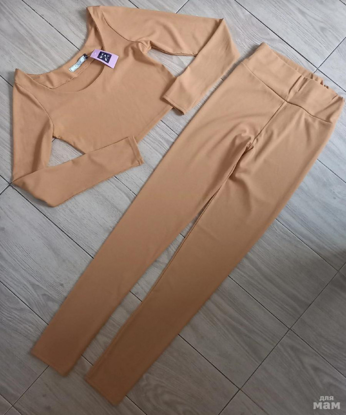 НОВЫЙ стильный комплект леггинсы и кроп-топ SHE'S р.S (42) на рост 164-170. Из трикотажа "лапша" цвета ириска. Кроп-топ с длинным рукавом и леггинсы с широким поясом на резинке. Очень мягкий и комфортный, облегает как вторая кожа. Посадка обалденная.