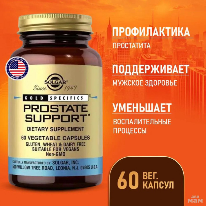 Цинк (в виде глицината цинка†) 10 мг Селен (в виде L-селенометионина) 25 мкг Модифицированный цитрусовый пектин (низкомолекулярный по массе) 200 мг Стандартизированный экстракт пальметты (ягода) (67,5 мг свободных жирных кислот [45%]) 150 мг Стандартизированный экстракт жгучей крапивы (листья) (диоксид кремния 1,5 мг [1%]) 150 мг Тыквенный порошок (семена) 100 мг Экстракт зародышей сои (2% изофлавонов) 100 мг Ликопин (из помидоров) 7 мг