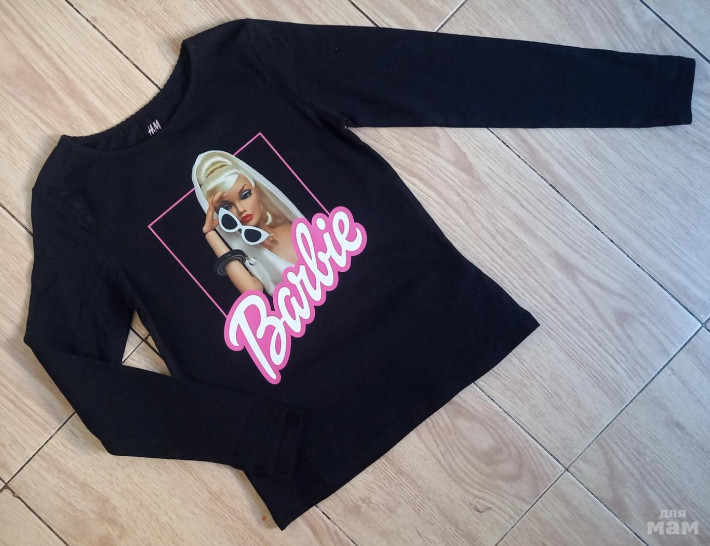 Лонгслив H&M Барби (Швеция) р.122-128 из органического хлопка. Цвет: чёрный. Принт Барби на груди.