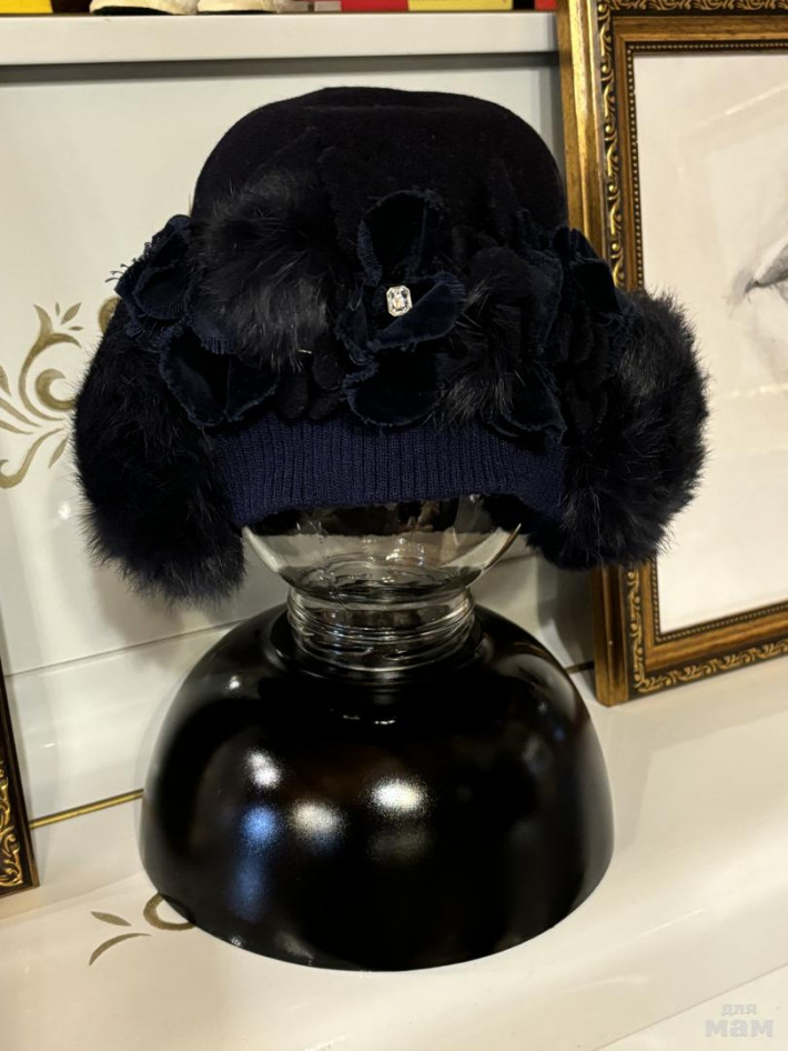 Очень красивый темно темно синий цвет. Мех очень качественный. Шерсть и материал шапочки - просто превосходные. Со стразами, красивое оформление бархатными цветочками и камушками. Шапочка не холодная. Из тепленького материала.