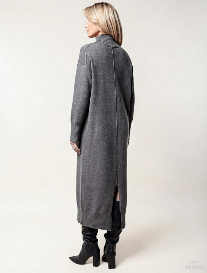 Платье с высоким воротом прямого силуэта, слегка зауженное к низу выполнено из мягкой пряжи с добавлением кашемира для комфортной носки. . Модель со спущенным плечом легко впишется в расслабленный осенний гардероб. Сзади изделие дополнено небольшим разрезом. Переплетение нитей разных оттенков создает деликатный меланжевый узор.