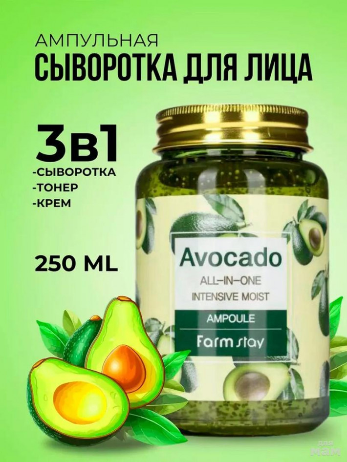 Многофункциональная ампула с экстрактом авокадо выполняет функцию сразу нескольких продуктов: тонера, сыворотки и крема. Средство позволяет обеспечить коже полноценный ухода и обеспечить её всем необходимым для поддержания молодости и красоты.