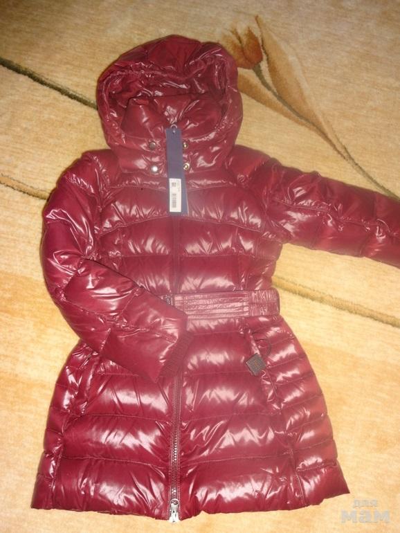 Новое пуховое пальто. Красивого вишневого цвета, хорошая набивка пухом, невесомое, но очень тёплое. Размер XXS (по-моему, 10 лет), но можно и раньше. На рукавах есть манжеты, карманы на молниях, капюшон отстёгивается. Пальто застёгивается на молнию. Сама молния с двумя бегунками.