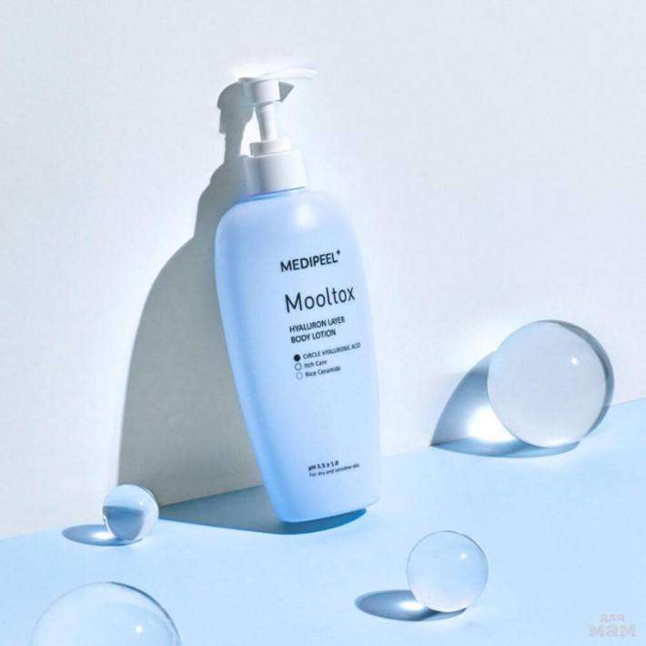 Аква-лосьон для тела MEDIPEEL Mooltox Hyaluron Layer Body Lotion на клеточном уровне устраняет причины обезвоженности: избавляет от стянутости, сухости и шелушения, восстанавливает оптимальный уровень увлажнения. Обладает показателем pH 5.5±1.