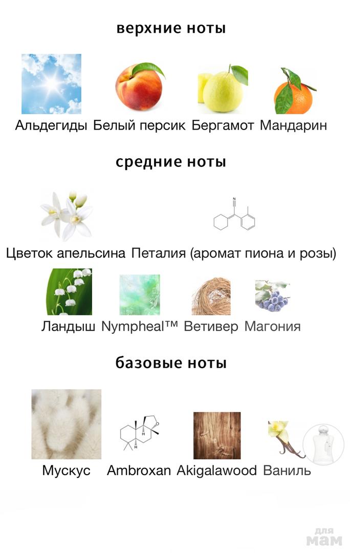 Верхние ноты: альдегиды, белый персик, бергамот, мандарин