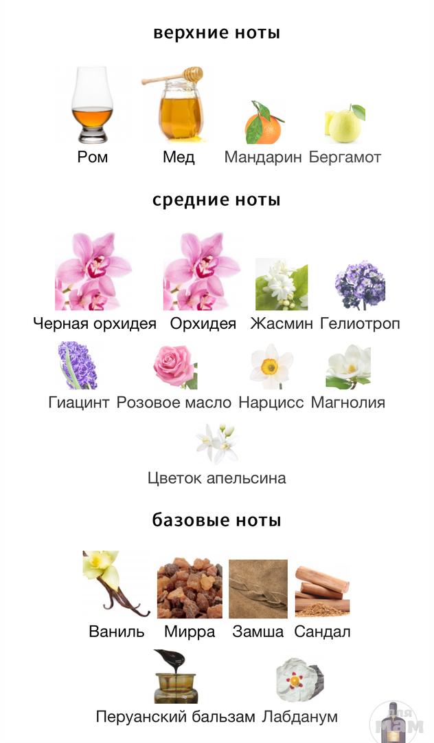 Ноты базы : мирра, сандаловое дерево, перуанский бальзам, абсолют ванили, кожа, лабданум.