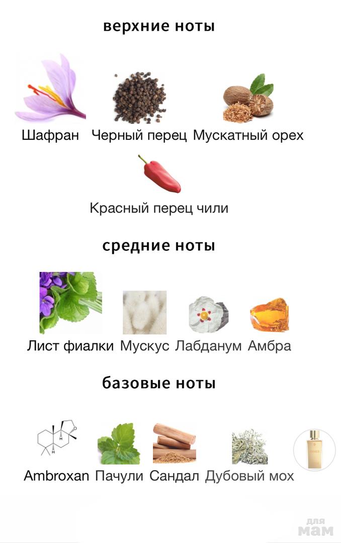 Верхние ноты: Черный перец, Шафран, Чили, Мускатный орех.