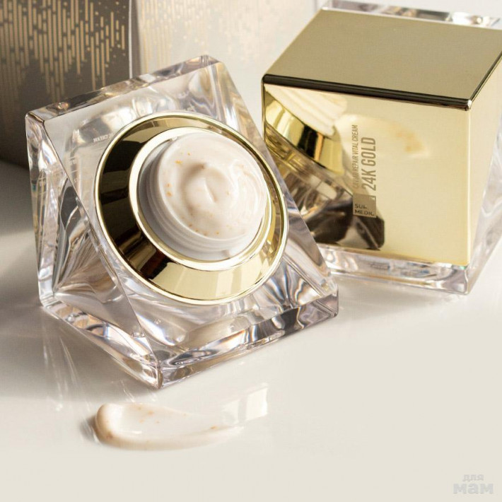В легкой текстуре средства находятся мельчайшие частички 24К золота, которые тают при нанесении крема на кожу, улучшая проникаемость и усвояемость активных ингредиентов. Крем быстро впитывается, не образуя жирной пленки и липкости.