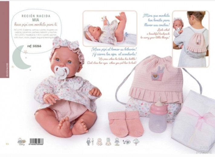Полностью виниловая, глазки закрываются. Умеет пить с бутылочки и писать. В комплекте рюкзачек с памперсами, бутылочкой и носочками.