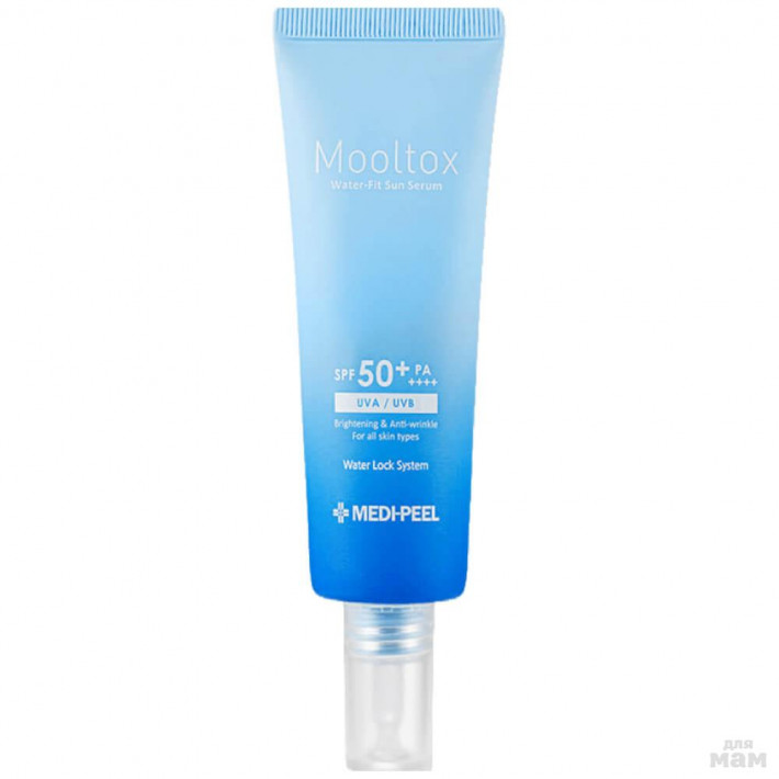 Ультраувлажняющая солнцезащитная сыворотка Medi-Peel Aqua Mooltox Water-Fit Sun Serum SPF50+ PA++++ на основе стабильных химических фильтров нового поколения обладаёт лёгкой невесомой текстурой и совсем незаметен на коже. Мгновенно наполняет влагой, избавляет от сухости и стянутости.