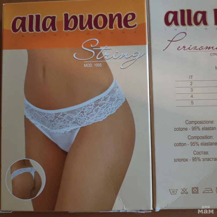 1. Женские изящные трусики - Alla Buone STRING , из хлопка (95%). С широким кружевным эластичным поясом сверху и гигиенической х/б ластовицей.