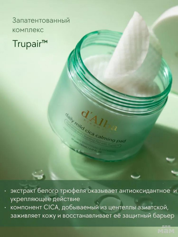 d'Alba Daily Mild Cica Calming Pad – это пэды для чувствительной кожи с успокаивающим действием в кратчайшие сроки помогут снять зуд, устранить сухость и раздражения, убрать покраснения. Деликатно очищают кожу от поверхностных загрязнений и мягко отшелушивают не нарушая pН-баланс кожи. Продукт для ежедневного применения прекрасно удаляет ороговевшие клетки эпидермиса и остатки загрязнений, деликатно полирует поверхность кожи, оказывает увлажняющее и успокаивающее действие. Ускоряет процессы естественной регенерации кожи, смягчает и способствует устранению шелушений. Пэды обильно пропитаны концентрированной эссенций, а благодаря большому размеру их удобно использовать на коже. CICA-комплекс даёт ярко выраженный заживляющий и успокаивающий эффект. Восстанавливает и смягчает кожный покров, убирает покраснения и шелушения, питает и укрепляет защитный барьер кожи. Регулирует водно-жировой баланс эпидермиса, ускоряет синтез волокон коллагена и эластина, повышает упругость кожи. Д-пантенол стимулирует восстановление целостности кожных покровов, снимает покраснения и раздражение, обладает ранозаживляющими свойствами. Растительный коллаген восстанавливает структуру эпидермиса изнутри, укрепляет стенки клеток, улучшает белковый обмен. Поддерживает матрикс кожи, разглаживает морщинки и заломы.
