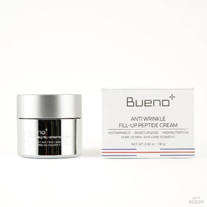 Пептидный крем против морщин Bueno Anti-Wrinkle Fill Up Peptide Cream оказывает мощное омолаживающее действие, способствует разглаживанию мимических морщинок и уменьшает глубину кожных заломов. Выравнивает рельеф, улучшает текстуру, уплотняет. Стимулирует синтез коллагена и повышает упругость и эластичность.