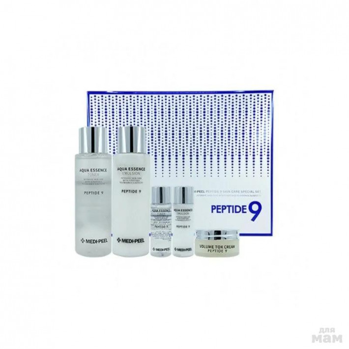 Роскошный абор антивозрастной косметики Peptide 9 Skin Care Special Set для ухода за возрастной кожей входит: тонер (250 мл, 30 мл), эмульсия (250 мл, 30 мл), мини тонер (30мл), крем (10 г) для лица Volume Tox Cream.