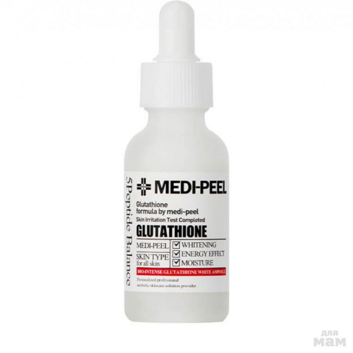 Осветляющая ампульная сыворотка с глутатионом Medi-Peel Bio-Intense Glutathione White Ampoule обладает ярко выраженным отбеливающим действием, снимает красноту, выравнивает тон кожи, помогает в борьбе с пигментацией и постакне.