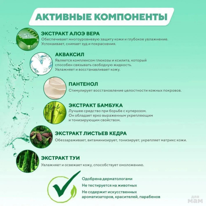 Основные действующие компоненты:◾ Экстракт алоэ вера обеспечивает многоуровневую защиту кожи и глубокое увлажнение. Он создает на поверхности кожи неосязаемую защитную пленку и препятствует испарению влаги, насыщает необходимыми минералами и микроэлементами, повышает иммунитет и защитные функции кожи.