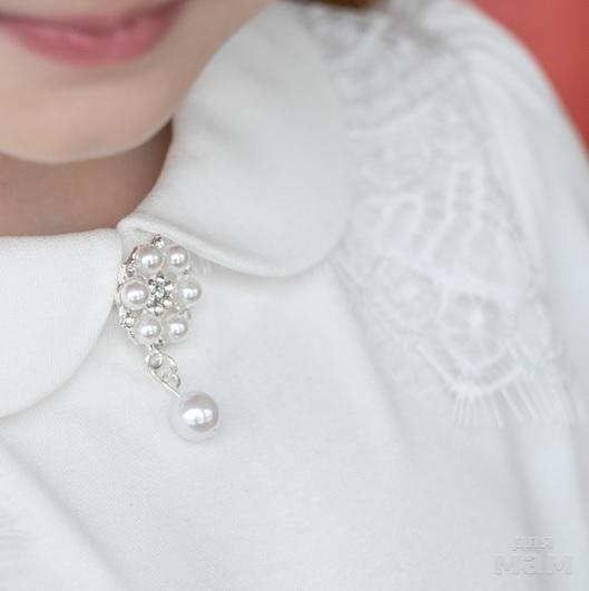 Модель блузки для младшей и старшей возрастной группы. Блузка из трикотажного полотна в комбинации с отделкой из шифона в полоску. Застёжка блузки на спине, под воротником, с разрезом формы-капля, на воздушную петлю-пуговицу. Воротник с округлыми краями и втачной стойкой. Верхняя часть воротника оформлена шифоном. Рукав модели полупрозрачный из шифона со сборкой по окату и низу рукава. Капля горловины спинки и низ рукава обработаны окантовкой из основной ткани. По центру воротника пристёгивается декоративная брошь виде банта из атласной ленты с цветком с пайетками в середине.