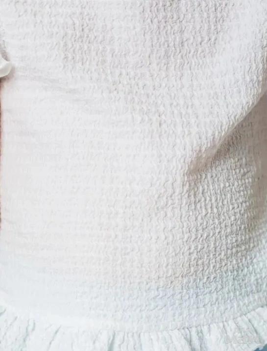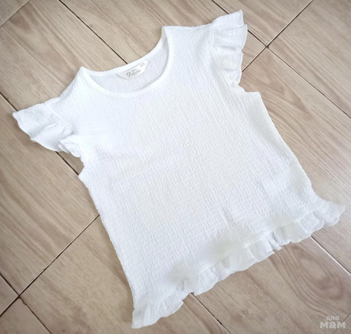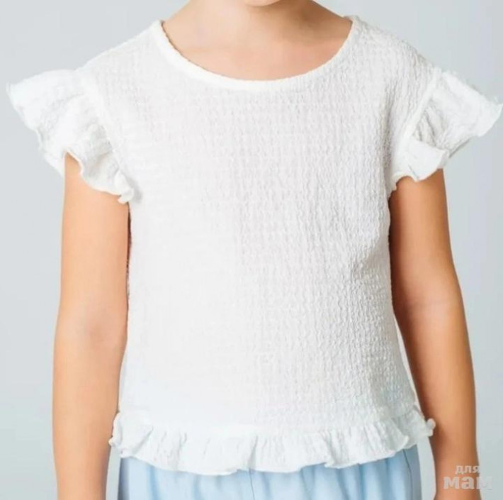 Блузка прямого кроя длиной ниже талии, круглый вырез горловины, короткие рукава-крылышки из широкой оборки. Такая же оборка идёт по нижнему краю.