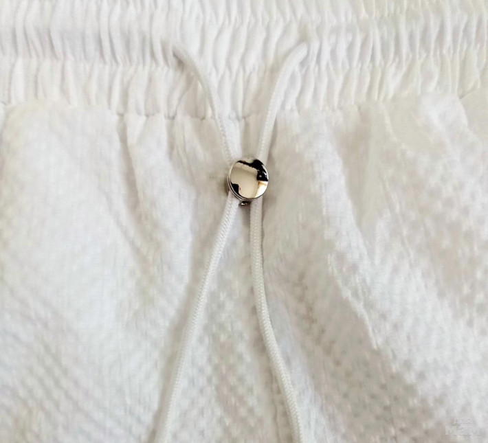Шорты с высокой посадкой, на широкой резинке со шнурком-кулиской с фиксатором, штанины широкие и расклешенные от бедра, внизу небольшие разрезы, карманы.