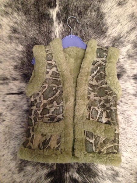 Жилет из натуральной цигейки/кожи. Принт змея. Цвет зеленый. Длинна 44 см. Ширина подмышками 33 см. Очень теплый. Очень удобно в сад на межсезонье. Состояние новой вещи.