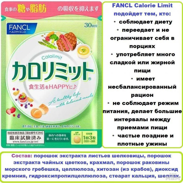FANCL Calorie Limit для блокирования калорий, поступающих с пищей и усиления метаболизма помогает обрести идеальную фигуру, не прилагая усилий.