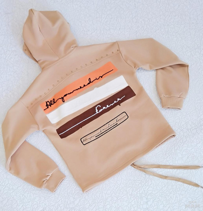 Очень красивое худи в сочном апельсиновом цвете, низ изделия необработан, смотрится эффектно, прозрачные надписи на сетке на спинке! Очень эффектный костюм с брюками палаццо (ниже)