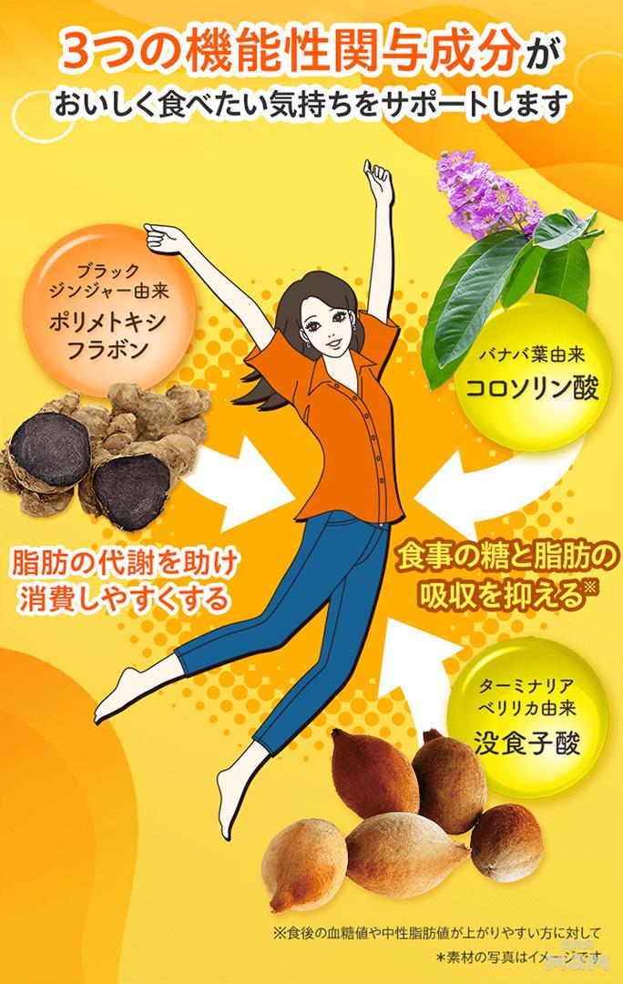 Этот комплекс содержит галловую кислоту из растения Terminalia berylica, коросоловую кислоту из листьев растения банаба (джимнема или тутовое дерево) и полиметоксифлавон из черного имбиря. Галловая и коросоловая кислоты подавляют всасывание сахара и жира у людей, у которых уровень сахара и триглицеридов в крови имеет тенденцию повышаться после еды. Полиметоксифлавон, полученный из черного имбиря, способствует ускорению метаболизма и сжиганию жира.