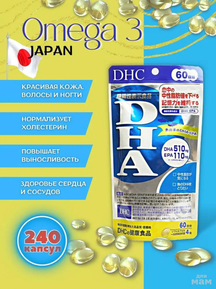Состав: рыбий жир ( DHA-510мг. EPA 110мг.)— это ингредиенты, которых много в голубой рыбе, такой как сардины и скумбрия (производства Японии), растительное масло, желатин, содержащий витамин Е, глицерин. Пищевая ценность на 4 капсулы (2020 мг) Калории: 14,7 ккал, белок: 0,48 г, жир: 1,37 г, углеводы: 0,11 г, солевой эквивалент: 0,005 г, витамин Е:60,0 мг.