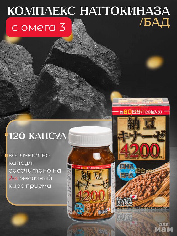 Содержание (в суточной дозировке – 2 капсулы): наттокиназа – 4200 FU, 70 мг DHA, 13 мг ЕРА.