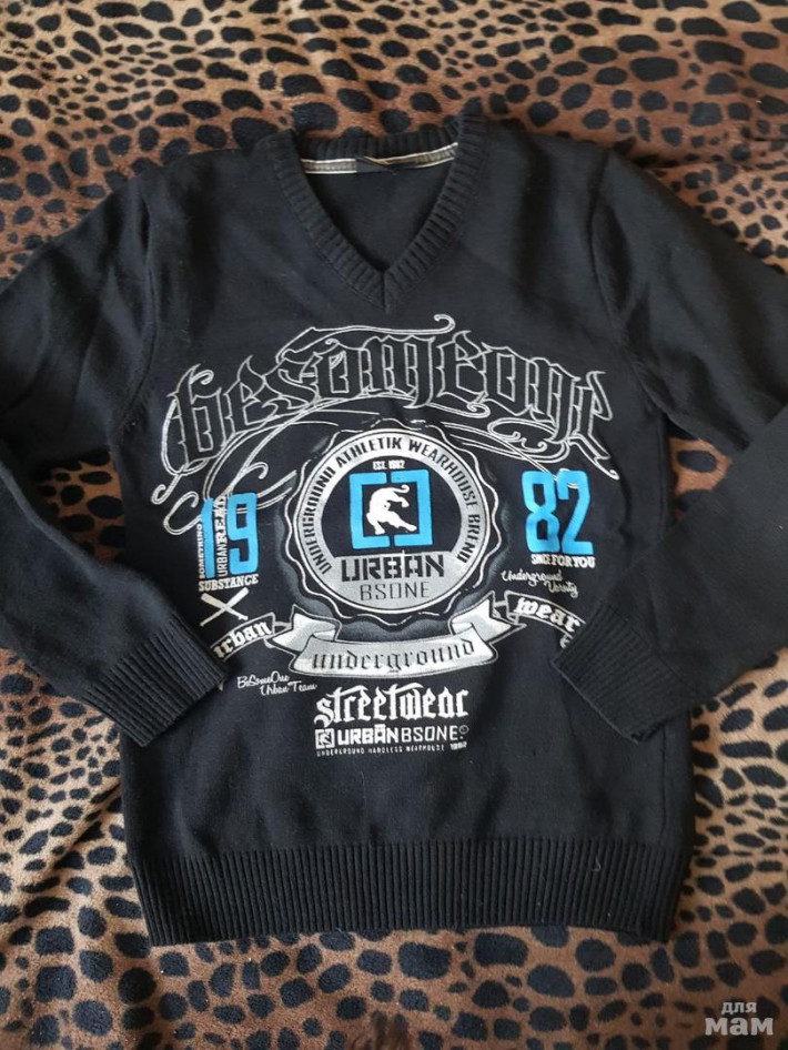 Свитер черный с эмблемой на груди, размер 150, 800 руб. Оба в идеальном состоянии.