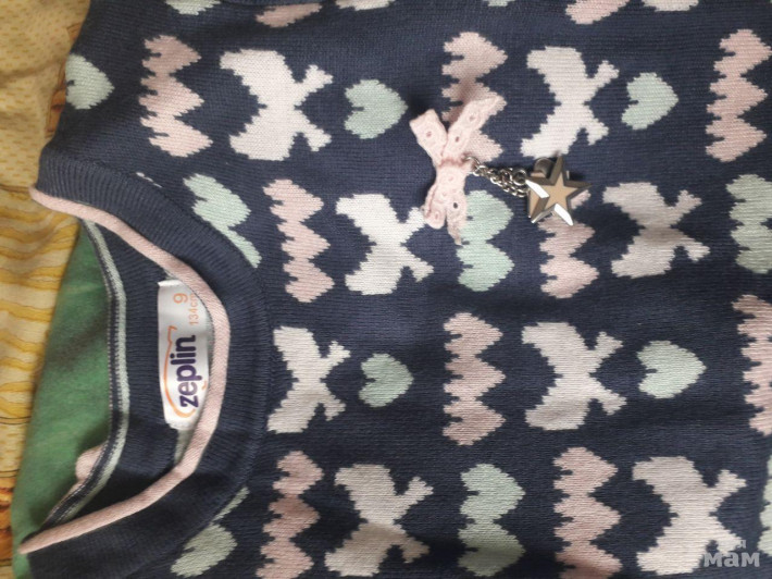 Платье трикотажное, Zeplin 134, серо-синее с рисунком, очень нежное. Цвет передан на фото не совсем верно, более серое в реале. Хорошо зимой в садик или в школу на выход. 1300 руб.