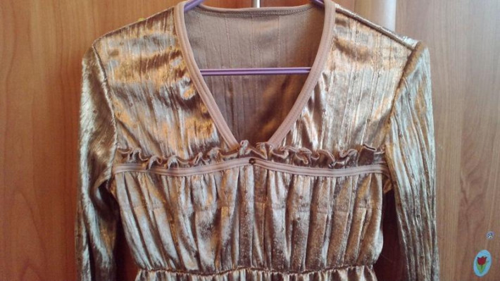 Надета 2 раза на праздник! В идеале! Красивого золотистого цвета (на фото немножко темнее). Размер 44-46. Состав ткани: 40% вискоза, 50% п/э, 10% хлопок. Длина по спинке 62 см. Внизу с напуском - модненько (не помню - как по-научному называется..! )) Покупала в магазине для беременных, но можно носить и так!