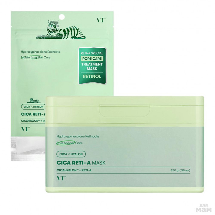 Набор масок для сужения пор с ретинолом VT Cosmetics Cica Reti-A Mask обладает мощным антиоксидантным действием, улучшает цвет лица, поддерживает кожу здоровой и замедляет процессы старения. Укрепляет стенки капилляров и повышает эластичность тканей, за счёт чего сужает расширенные поры, сокращает выраженность сальных нитей и способствует осветлению чёрных точек.