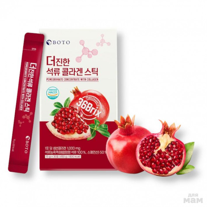 BOTO POMEGRANATE CONCENTRATE WITH COLLAGEN - Функциональный продукт для красоты и здоровья на основе натурального гранатового сока с добавлением морского коллагена. Каждая порция содержит концентрированный экстракт граната с высоким содержанием антиоксидантов, витаминов и минералов, а также коллаген, который способствует укреплению кожи, повышению её упругости и сохранению молодости.