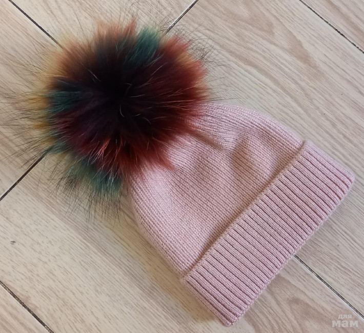 Классная шапочка DP р.10/12 (52-54). Из мягкой пряжи пудрово-розового цвета с мягким ненавязчивым блеском. Состав: 50% полиэстер, 20% акрил, 20% полиамид, 10% шерсть. Крутой радужный большой помпон из натурального меха енота с иглами. Вязка резинка, с отворотом, на хлопковой подкладке. Температурный режим +10-5⁰С.