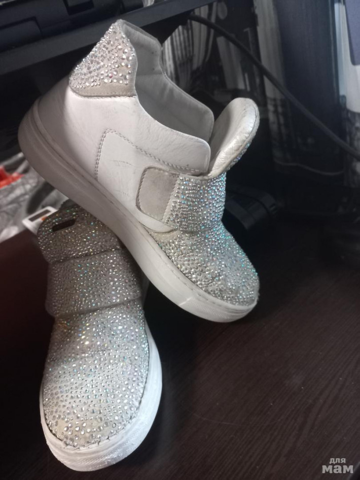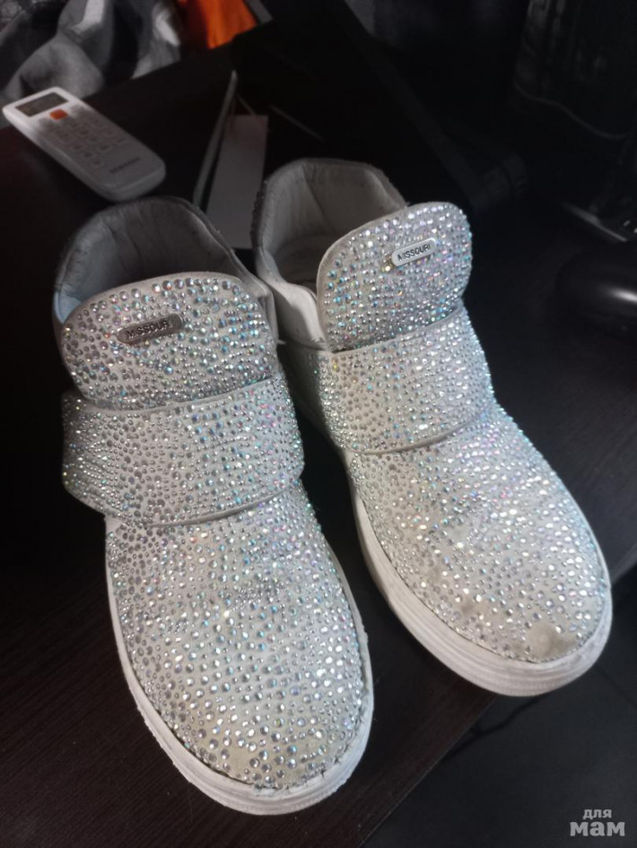 Размер 32. По стельке примерно 21, может чуть больше , на носу не хватает страз, при носке не заметно, так как они сверкают.