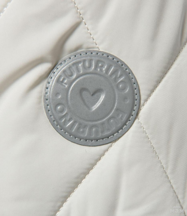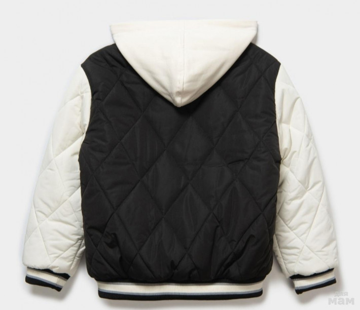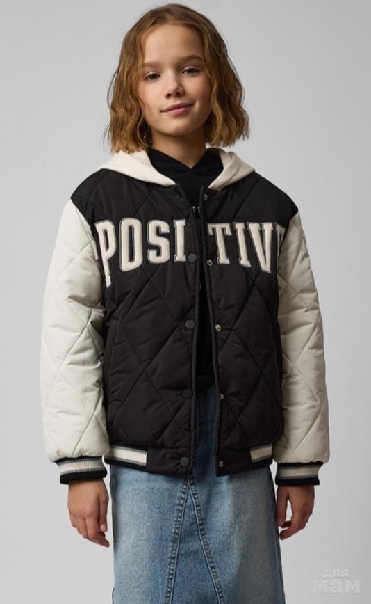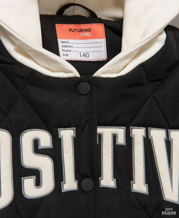 Стильная стёганная куртка-бомбер FUTURINO р.140. Цвет: чёрный/молочный. Бомбер с трикотажным капюшоном и надписью POSITIVE. Утеплен полиэстером плотностью 200 г/м².