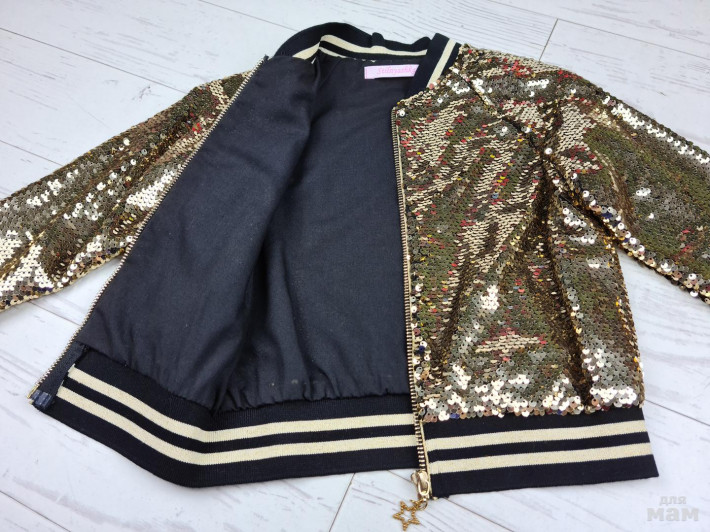 Пайеточный бомбер на хлопковой подкладке: длина по спинке 37 см, длина рукава от горловины 49,5 см.