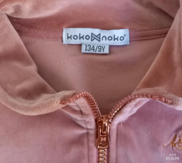 Выполнена из мягкого шелковистого велюра цвета пыльной розы. Широкие лампасы с названием бренда медного цвета на рукавах, воротник-стойка, застёжка на блестящую тракторную молнию, два прорезных кармана, трикотажные манжеты на рукавах и по нижнему краю.